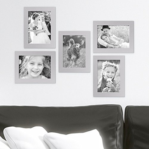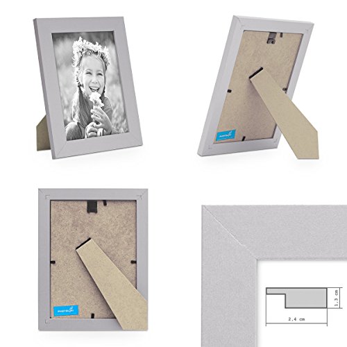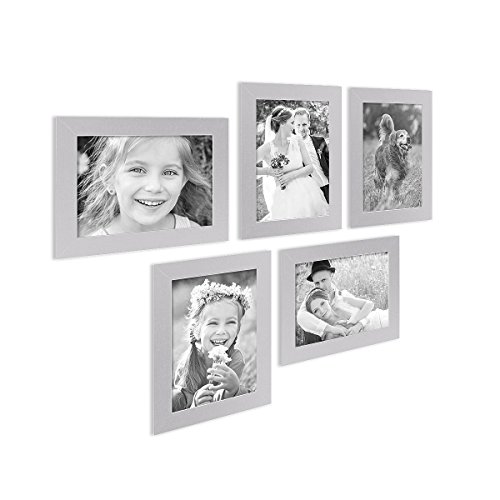 Bilderrahmen-Set in Silber zur Gestaltung einer individuellen Bilderwand oder Bildergalerie mit gutem Preis-Leistungsverhältnis – stabile Wechselrahmen aus MDF und praktisches Zubehör. Bilderwände haben einen ganz besonderen Charme und verleihen dem eigenen Zuhause einen individuellen Charakter. Sie sind eine tolle Möglichkeit um Fotos, Postkarten, Zeichnungen oder andere Erinnerungsstücke an der Wand in Szene zu setzen. Mit diesem Bilderrahmen-Set lässt sich eine individuelle Bilderwand einfach selbst gestalten. Die Bilderrahmen lassen sich zu unterschiedlichen Anordnungen und Arrangements kombinieren – ganz symmetrisch in einer Reihe, als Raster oder locker über die Wand verteilt. Die Bilderwand lässt sich jederzeit erweitern und mit anderen Bilderrahmen-Sets ergänzen. Die mitgelieferten Schablonen helfen dabei die verschiedenen Bilderrahmen optimal an der Wand anzuordnen und die Bildernägel an der richtigen Stelle zu positionieren. (Motive und Dekoration sind nicht im Lieferumfang enthalten.) LIEFERUMFANG:5x Bilderrahmen 10×15 cm / Außenmaß: 13,7×18,7 cm1x Mini-Wasserwaage1x Anleitung zur Gestaltung einer Bilderwand 5x Papier-Schablone zum einfachen Ausrichten1x Bildernägel zum schnellen Aufhängen Alle Bilderrahmen sind mit einem stabilen Aufsteller ausgestattet und lassen sich im Hoch- oder Querformat aufstellen oder an die Wand hängen.