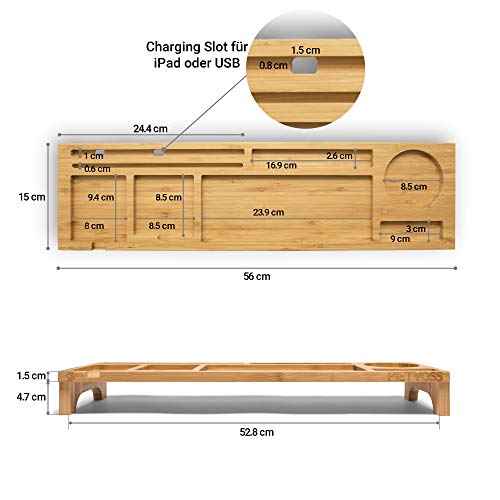 Unser Premium Schreibtisch Organizer: Ideal für Angestellte, Selbstständige und Künstler, die endlich wieder Ordnung ins Chaos bringen wollen! Du kennst das: Du willst Dich an die Arbeit machen aber auf den Schreibtisch liegt wieder alles kreuz und quer herum? Du verwendest täglich von neuen Zeit dafür Deinen Arbeitsplatz zu organisieren? Mit unserem Premium Schreibtisch Organizer ist Schluss damit! Durch sein raffiniertes Design in Form eines schmalen Tastatur-Regals findet er auf jedem Schreibtisch Platz. Ob ToDo-Liste oder Arbeitswerkzeuge – in den Fächern sind alle Utensilien schnell zur Hand. Auch die Kaffetasse kann sicher aus dem Bewegungsbereich der Computer-Maus gebracht werden. Das hochwertige Bambus Accessoir macht dabei auf Arbeitsplätzen jeder Farbe eine tolle Figur. Das vertikal verpresste Moso-Bambus (auch bekannt von hochwertigen Schneidbrettern) ist wiederstandsfähig und formstabil, weswegen Du lange Freude an diesem Organizer haben wirst. Deine Vorteile auf einen Blick: Höhere Effizienz und Kreativität da alles seinen Platz hat Aufgeräumter Arbeitsplatz, welcher auch von Kollegen und Vorgesetzen positiv wahrgenommen wird Wohlbefinden am Arbeitsplatz durch den hochwertiges Design und warmen Holz GRATIS Tipps zur Produktivitäts-Steigerung in der Anleitung! Unser Zufriedenheits-Versprechen: Wenn Du nicht 100% zufrieden bist, schicke ihn einfach zurück – wir vertrauen auf unsere Qualität und wollen, dass Du zufrieden bist! …Gemacht für alle, die das Beste wollen! Der multifuntionale Design Organizer in Top-Qualität! Klicke jetzt auf das Einkaufswagenfeld und schaffe Ordnung auf Deinen Schreibtisch!