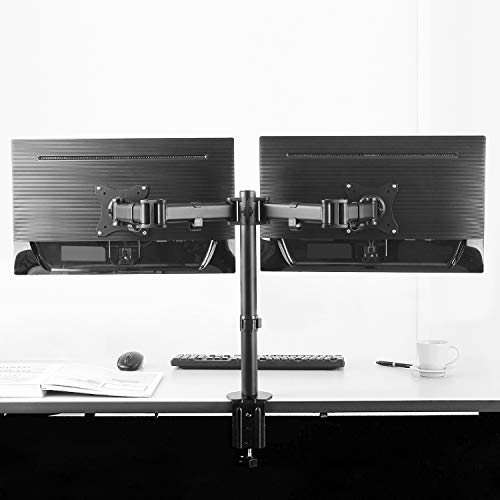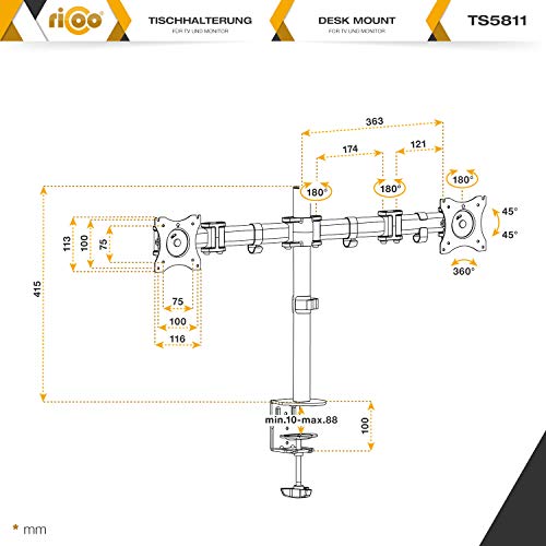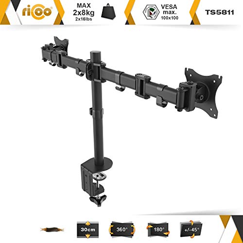 Tisch-Halterung für 2 Monitore,Bildschirm-Halterung 2 Monitore,Bildschirm-Ständer 2 Monitore. Diese Monitortisch-Halterung unterstützt VESA-Norm Schraubloch-Abstände: Horizontal / Waagerecht: 75mm, 100mmVertikal / Senkrecht: 75mm, 100mmNur wenn Ihr Gerät dieser Loch-Abstand hat, passt die Bildschirm-Erhöhung für den Flat-Screen.Wichtiger HinweisAlle Diagonal-Angaben in der Artikel-Bezeichnung / Beschreibung / Produkt-Verpackung sind ungefähre Orientierungsangaben. Für die Wahl von Bildschirm-Halter ist nicht die Bildschirm-Diagonale entscheidend, sondern die VESA. Diese Monitor-Schwenkarm ist auch für 144hz Monitore 24 zoll 27 zoll geeignet. Es muss nur gewährleistet sein, dass die VESA-Lochabstände innerhalb dem von der Halterung unterstützten Bereich liegen und das max. Belastungs-Gewicht der Schreibtisch-Halterung nicht überschritten wird. Ein Standfuß für Ihren PC-Monitor ist ein praktisches Zubehör für Ihre Büro-Möbel. Voll-bewegliche Tisch-Halter für Ihr Monitor-system machen das Arbeiten am Computer effizienter, da sich Ihre Körper-haltung verbessert. Eine ergonomische Arbeitstisch-halterung mit beweglichem Gelenk-arm von RICOO erhöht die Ergonomie am Arbeits-platz. Unsere Bildschirm-Ständer eignen sich ebenfalls für Curved-Fernseher Gaming-Monitore, egal welche Technik im Display steckt. Sowohl LED-,LCD-,TFT-Display passen. Für Bildschirme ohne VESA-Löcher gibt es 4 Adapter-Platten zum Ein-Klemmen. Dank dieser Erweiterung können Sie ganz flexibel jeden Flachbild-Gerät ohne Schrauben anbringen. Die Tisch-montage ist Dank der basic gehaltenen Tisch-klemme ganz einfach an der Stahl-Stange der Halterung zu machen. Ein Kabel-management in Form einer Kabel-führung sorgt dafür, dass Sie keinen Kabel-salat aus hdmi-kabel und vga-kabel bekommen. Dieser Stand-fuss ist nicht für den Boden gedacht. Dafür ist sie hoch,ausziehbar,klappbar,klein, kompakt und kurz.