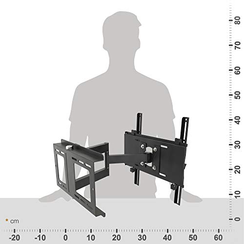 Diese Fernsehhalterung beziehungsweise dieser Fernseherhalter ist eine Fernseheraufhängung für Flatscreen Bildschirme. Die Universalhalterung/der Universalhalter ist vollbeweglich und passend für 4K Smart-TV QE QLED OLED UHD Full HD Ultraslim und Smart TV Flachbildfernseher Flachbildschirm. Eine Fernsehwand mit Fernsehhalter Wandhalter verleiht Ihrem Zimmer oder Wohnzimmer Modern Design. Unsere Flachbild Bildschirm Fernsehaufhängung ist eine normierte Aufhängung für die Wohnwand im Heimkino oder im Schlafzimmer und sorgt für großes DVBT2 Kino Zuhause daheim. Dank der Kabelführung und dem Kabelkanal am Schwenkarm können Sie Ihre Kabel ganz einfach verstecken. Ein Adapter bzw eine Adapterplatte ist für diese Halterung mit Doppelarm nicht erhältlich. Die Fernsehaufhängung ist nicht für für das Camping im Caravan oder für das Fernsehen im Wohnmobil oder den Wohnwagen geeignet. Ebenfalls sollte sie nicht outdoor montiert werden. In unserem Portfolio befinden sich auch Deckenhalterung, für die Decke oder Dachschräge, in der Funktion ausziehbar, arretierbar oder sogar abnehmbar. Sogar Fullmotion Halterungen mit Motor/elektrisch für die Ecke, die mit einer Fernbedienung komplett motorisiert vollbeweglich verstellbar sind. Die Eckmontage ist möglich Dank einer Gasdruckfeder am Teleskop Gelenk. Die Gasfeder mit Gasdruck macht das Gestell leicht höhenverstellbar, rotierbar und kippbar – nicht klein, starr, breit oder extra flach bzw ultra slim, sondern lang. Besonders ultraslim oder mit Verlängerung sind andere Befestigungen von uns. Nicht vorhanden ist eine Ablage oder 2 Ablagen für Receiver, Lautsprecher oder Soundbar. Ohne Schrauben und ohne Bohren ist keine gute Halterung fest monitierbar. Vor allem nicht am Tisch oder an Wänden aus Gipskarton. Bei manchen unseren Modellen ist eine Wasserwaage als Zubehör dabei. Wir haben Halterungen zum Einhängen, Schieben, Ausziehen, Schwenken und Verschieben. Auch aus Aluminium und zweiarmig. Sogar mit Quick Release Feature.