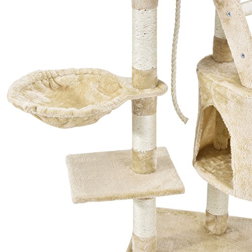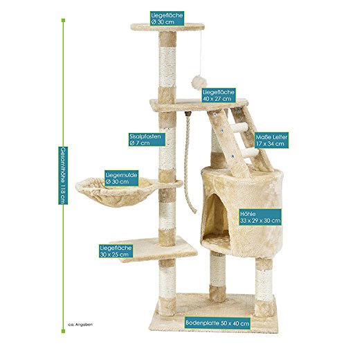 Der Kratzbaum „Buffy“ (beige) von Sam's Pet ist für jede Katze ein echtes Highlight. Die robusten Sisalstämme und die die Leiter mit Sisalsprossen eignen sich ideal zum Krallenwetzen, sodass Ihre Möbel unversehrt bleiben. Eine Kuschelhöhle und eine Liegemulde aus hochwertigem Plüsch laden zum Relaxen ein. Auf den drei Aussichtsplattformen mit Plüschüberzug hat Ihre Katze alles im Blick. Der Kratzbaum bewährt sich jedoch auch als Spielplatz. Neben einem Spielseil und einem Bommel am Gummizug stehen Ihrer Katze weitere Möglichkeiten zum Springen, Klettern und Toben zur Verfügung. Dank seiner kompakten Bauweise ist Kratzbaum besonders platzsparend und findet selbst in kleinen Räumen seinen Platz. Den Kratzbaum „Buffy“ erhalten Sie auch in den Farben grau, braun, schwarz und leopard. Produktmerkmale: Stabiler Kratzbaum für Katzen Kompakte Stellfläche 1 runde Kuschelhöhle mit Plüschüberzug zum Schlafen 3 Liegeflächen zum Liegen, Ausruhen & Beobachten in unterschiedlicher Höhe 1 runde Liegemulde aus Plüsch zum Relaxen Spielseil und 1 Bommel am Gummizug zum Spielen Sisalstämme und Leiter mit Sisalsprossen ideal zum Krallenwetzen Kompakte Stellfläche Technische Daten: – Material: Spannplatte, Plüsch, Sisal – Farbe: beige – Gewicht: ca. 13 kg Abmessungen (alle Angaben sind ca.-Angaben in cm): – Gesamthöhe: 118 – Maße Bodenplatte: 50 × 40 – Maße Kuschelhöhle: 33 × 29 × 30 – Maße Leiter: 17 × 34 – Durchmesser Liegemulde: 30 – Maße untere Liegefläche: 30 × 25 – Maße mittlere Liegefläche: 40 × 27 – Durchmesser obere Liegefläche: 30 – Durchmesser Sisalpfosten: 7 Lieferumfang: -1 × Kratzbaum „Buffy“ in beige als Bausatz zur Selbstmontage -1 × deutschsprachige Aufbauanleitung