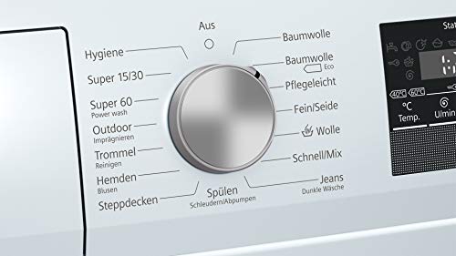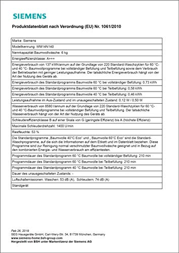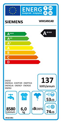 Die Waschmaschine Siemens WM14N140 iQ300 eignet sich mit einem Fassungsvermögen von 6 kg optimal für einen kleineren Haushalt. Die WM14N140 verfügt über ein Outdoor/Imprägnier-Programm für eine schonende Wäschepflege von hochwertigen und atmungsaktiven Funktionstextilien. Die Bedienung der WM14N140 gestaltet sich durch die übersichtlichen TouchControl-Tasten und den Programmwähler kinderleicht. Die sensorgesteuerte Beladungserkennung sorgt für wassersparendes Wäschewaschen dank waterPerfect. Mit der varioSpeed-Option lässt sich der Waschprozess um bis zu 65% beschleunigen. Auch in puncto Sicherheit glänzt die WM14N140 mit der AquaStop-Funktion, der Schaumerkennung und einer Unwuchtkontrolle. Mit einem Verbrauch von 137 kWh Strom und 8580 Litern an Wasser zählt die WM14N140 zur Energieeffizienzklasse A+++ und wäscht besonders effizient.