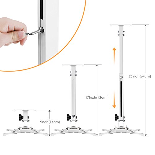 SIMBR Beamer Decken- und Wandhalterung hat ein elegante Design und ist kompatibel zu meisten gängigen Projektoren, z.B. ACER, BENQ, CASIO, EPSON, HITACHI, INFOCUS, LG, NEC, OPTOMA, VIEWSONIC und so weiter. Wird diese Beamer Halterung zu meinem Projektor passen?1. Die Deckenhalterung muss in den Zement, Beton, Ziegelsteinen , dicke Holzbrettern oder dicke Wände installiert werden. 2. Allgemeine Projektoren verfügen über drei oder vier Befestigungslöcher. Und der Abstand zwischen beliebigen zwei der Befestigungslöcher muss innerhalb des Bereichs von 170mm bis 317mm sein. 3. Das Gewicht des Projektors muss innerhalb des Bereichs von 15 kg sein. 4. Unsere gelieferte Befestigungsschrauben sind für die meisten gängigen Projektoren geeignet. Multi-Blickwinkel Um sich an die eigenen Bedürfnisse anzupassen, lässt sich die Position des Beamers variabel einstellen, neigbar ±30° , schwenkbar ±30° und rotiebar 360°. Und die Halterung hat einen Wandabstand von 420mm bis 640mm. Kinderleicht zu montieren und demontieren Mit einem Schnellverschluss bietet die Halterung eine komfortable Art den Beamer an der Decke oder Wand zu befestigen. Dank der Grundplatte samt Haltarmen abnehmbar, kann die Halterung in wenigen Handgriffen wieder zu demontieren. Technische Daten Farbe: Weiß Material: Eisen Gewicht: 2.32kg Neigebereich: -30° ~ +30° Schwenkbereich: -30° ~ +30° Rotation: 360° Geeignete Lochabstände von Beamer: 170mm ~ 317mm Abstand von Wand oder Decke: 420mm bis 640mm Max. Tragkraft: 15 kg Lieferumfang1x SIMBR Beamer Halterung 1x Montagematerial 1x Montageanleitung Garantie Unsere Firma bietet ihren Kunden eine Garantie von 18 Monaten ab Kaufdatum. Falls Sie mit unserem Produkt dennoch nicht zufrieden sein sollten, können Sie uns gerne kontaktieren.