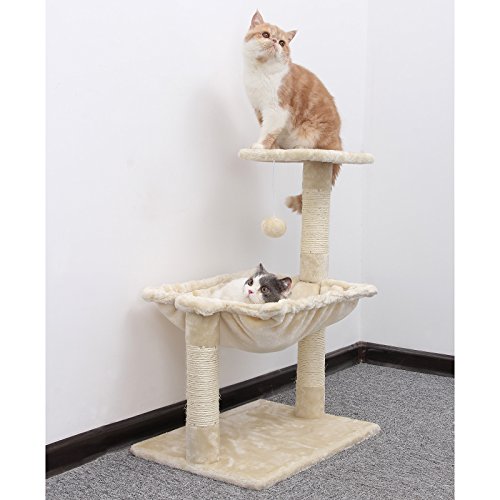 Auf diesem Katzenkratzbaum von Songmics genießen Ihre Stubentiger den neuen Blickwinkel. Mit einer großen Bodenplatte von 50 x 36 cm und dem Durchmesser der Säulen von 7,1 cm ist er ein stabiler und fest stehender Kratzbaum. Stabile Stämme und Natursisal bieten eine Möglichkeit zum angenehmen Krallenwetzen. Mit einem Kratzbaum können Katzen ideal ihre Krallen schärfen und dabei bleiben Ihre Möbel unversehrt. Ihre Katze kann hier spielen, toben oder ausruhen und Zeit verbringen. Diese schöne Kombination könnte bald der Lieblingsplatz Ihrer Katze sein, zudem wird sie Ihnen und Ihrer Katze lange Freude bereiten. Hinweise: – Die Bällchen sind nur Dekorationsteile, es ist normal, wenn Sie von den Katzen abgerissen werden. – Es könnte sein, dass der Artikel beim Auspacken „neu“ riecht. Aber dieser Geruch wird nach einigen Tagen verschwinden, wenn man den zusammengesetzten Kratzbaum in einen belüfteten Raum stellt. – Ziehen Sie die Schrauben von allen Teilen 2-3 Tagen nach der Montage bitte nochmal fest. – Es wird empfohlen, dass der Kratzbaum an eine Wand gelehnt oder in einer Ecke gestellt wird, um die Instabilität und Wackeligkeit des Kratzbaums beim Klettern von schweren Katzen zu vermeiden. – Belastbarkeit: 1 Katze (≤ 7 kg) Produktdetails: – Farbe: beige – Maße Bodenplatte: ca. 50 x 36 cm – Maße der rechteckigen Mulde: ca. 40 x 12 x 36 cm (B x H x T) – Gesamthöhe: ca. 70 cm – Gewicht: ca. 4,1 kg Lieferumfang: – 1 x Kratzbaum – 1 x Anleitung