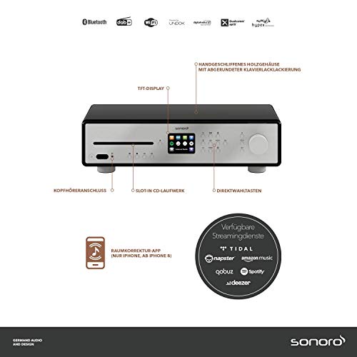 MAESTRO, der audiophile Alleskönner für Ihr Wohnzimmer: Einfach ein Paar Lautsprecher anschließen und die große Hi-Fi Welt steht Ihnen offen. CD-Player, FM-, Digital- und Internetradio, sowie Streaming-Services garantieren vielseitigen Musikgenuss. Zusätzlich bietet MAESTRO einen optischen und einen Koaxial-, sowie einen Phono-Anschluss (MM). Bedient wird direkt am Gerät, über die Fernbedienung oder per UNDOK-App. Die Hypex-Endstufen bieten mit 2 x 170 Watt genug Leistung für alle Lebenslagen und mit der Raumkorrektur-App entlocken Sie ganz einfach jedem Lautsprecher auch in Ihrem Wohnzimmer sein akustisches Maximum.