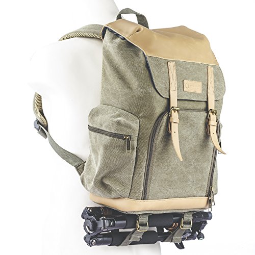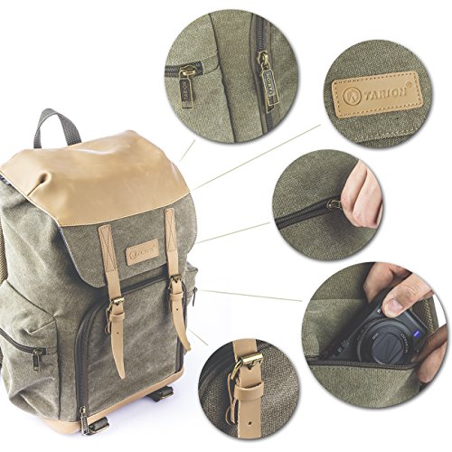 Beschreibung: ∙ Dieser Kamerarucksack aus imprägniertem (Wasserabweisend) Baumwoll-Leinengewebe und Echtleder ist in zwei Hälften unterteilt. ∙ In der unteren Hälfte lässt sich Ihre Kamera samt Objektiven und Zubehör (Ladegerät, Fernauslöser, Adapter , Makroringe usw.) sicher verstauen während in der oberen Hälfte Verpflegung, Kleidung, Pads und Ähnliches untergebracht werden kann. ∙ Der untere Teil kann schnell und bequem mit Reisverschluss geöffnet werden. Innen befindet sich ein gepolstertes Fach mit separaten Schaumstoff Zwischenwänden mit Klettverschlüssen , die man variabel anordnen kann. ∙ Am Boden der Tasche befinden sich Laschen wo ein Stativ sicher befestigt werden kann. ∙ Für zusätzlichen Schutz vor starkem Regen ist auch eine passende Regenhaube im Lieferumfang enthalten. Spezifikation: Material: Baumwoll-Leinengewebe & Echtleder (Imprägniert: Wasserabweisend) Außenmaß: ca. 29 x 18 x 42cm Lieferumfang: 1x TARION TB-04 Kamerarucksack1x Schwarze Regenhaube