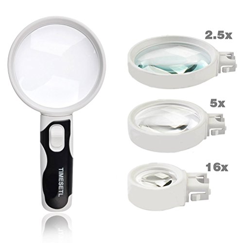 Professionale Qualität Deallink handhelde Leselupe mit LED Belechtung ist ein nützlich hilfer für die Menschen, die eine Alterssichtigkeit hat, auch perfekt für die Feinarbeit und Beobachten. Diese Lupe hat 3 hochwertige Linsen, die Vergrößerung 2.5, 5 und 16 Fach ist. Die Linsen ist mit dem smarten Design leicht zu wechseln. Mit heller Leuchte In der Nacht kann die Senioren mit der Lupe auch lesen. Die Lichtquelle ist 2 hochwertige LED Chips und die augenpflege Beleuchtung ist hell und soft. Die Leuchtesystem braucht 3 AAA Batterien und der Lieferumfang enthält keine Batterie. 3 Vergrößerungslinsen 1. 2.5 Fach Linse: 220mm Brennweite, 90mm Durchmesser 2. 5 Fach Linse: 115mm Brennweite, 100mm Durchmesser 3. 16 Fach Linse: 38mm Brennweite, 48mm Durchmesser Lieferumfang 1 x LED Leselupe mit 3 Linsen Set