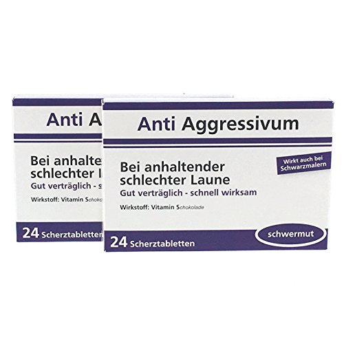 Scherztabletten aus Schokolade. Zwei Packungen. Eine Packung a 22g Inhalt. Zutaten: Vollmilchschokolade (53%):(Zucker, Kakaobutter, Vollmilchpulver, Kakaomasse, Süßmolkenpulver, Milchzucker,Magermilchpulver, Emulgator:Sojalecithine, Vanilleextrakt), Zucker, Farbstoffe: E171, E120, E100, Verdickungsmittel: Gummi arabicum, Glukosesirup, Gelatine, Vanilleextrakt, Überzugsmittel: Bienen- und Carnaubawachs. Vollmilchschokolade (Kakao: 30% mindestens) Hinweis: Kann Spuren von Erdnüssen und Schalenfrüchten enthalten.