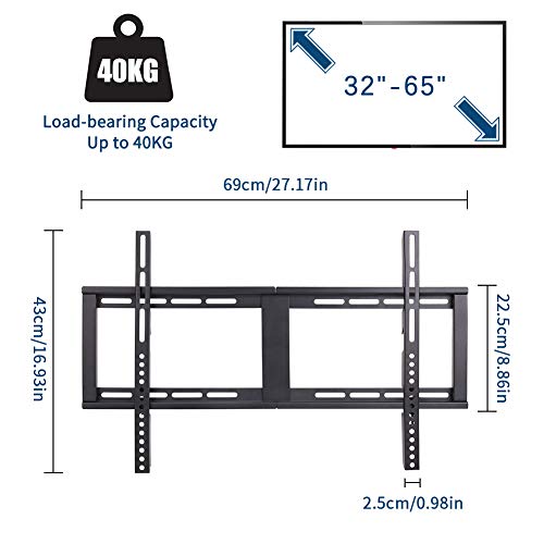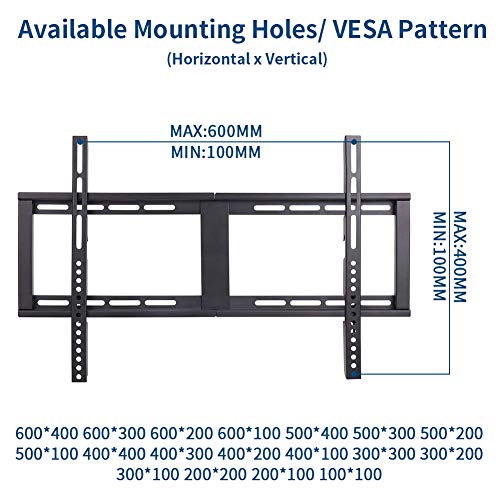 unho TV Wandhalterung Fernseher Halterung für LED LCD OLED PLASMA 32″- 65″ Fernseher TV Typ: Passend für alle Flach TV-Geräte Kompatible TV-Größe: 32 – 65 zoll Maximale Tragfähigkeit: 40kg Wandabstand: 25mm Material: SPCC Stahl Montage: Diese TV-Halterung ist für die Installation von massivem Beton, Betonblockwänden und Holzpfosten vorgesehen. Es ist NICHT für den Trockenbau oder Gipskartonwand geeignet! Kompatible VESA: 600x400mm, 600x300mm, 600x200mm, 600x100mm, 500x400mm, 500x300mm, 500x200mm, 500x100mm, 400x400mm, 400x300mm, 400x200mm, 400x100mm, 300x300mm, 300x200mm, 300x100mm, 200x200mm, 200x100mm, 100x100mm Einfache Installation: Schritt 1: Befestigen Sie die Schienen an der Rückseite Ihres Fernsehers. Schritt 2: Bohren Sie die Befestigungslöcher in der Wand und befestigen Sie die Wandplatte dann sicher. Schritt 3: Platzieren Sie den Fernseher schließlich auf der Halterung und ziehen Sie ihn fest. Passt für mehrer Position: Die TV Halterung ist perfekt für Wohnzimmer, Schlafzimmer, Büro oder Schule. Der Farbe passt auch jede Situation Kompatibilität: Passt für Sony, Samsung, LG, Panasonic, Philips, Toshiba, Sharp, Mitsubishi, Sanyo, JVC, Logik, DIGIHOME, Technika usw. Lieferumfang 1×TV Wandhalterung 1×Anleitung 1(Set)×Montagezubehör