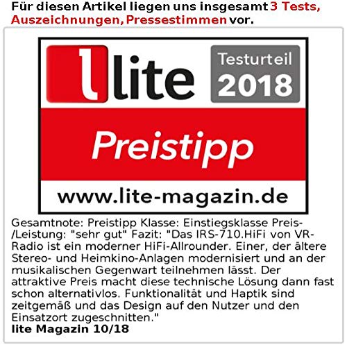 Erweitern Sie Ihre HiFi-Anlage und spielen Musik von nahezu jeder Quelle abAUSZEICHNUNGEN / BEWERTUNGEN / PRESSESTIMMEN:lite Magazin (10/18): Gesamtnote: Preistipp Klasse: Einstiegsklasse Preis-/Leistung: „sehr gut“ Fazit: „Das IRS-710.HiFi von VR-Radio ist ein moderner HiFi-Allrounder. Einer, der ältere Stereo- und Heimkino-Anlagen modernisiert und an der musikalischen Gegenwart teilnehmen lässt. Der attraktive Preis macht diese technische Lösung dann fast schon alternativlos. Funktionalität und Haptik sind zeitgemäß und das Design auf den Nutzer und den Einsatzort zugeschnitten.“ , AudioVideoFoto Bild (12/18): Fazit: „… eine ideale Modernisierung, wenn zum Beispiel im Zuge der Kabel-Analogabschaltung das Radio stumm wird.“ , reinHOEREN.de (09/18): Produktvorstellung. Erleben Sie grenzenloses Musikvergnügen – ob per Digitalradio, Internetradio, Netzwerkstreaming, per Spotify Connect oder MP3! Erweitern Sie Ihre HiFi-Anlage und hören Sie zu Hause Ihre Lieblingsmusik von nahezu jeder Audioquelle! Genießen Sie die Vielfalt des Internet-Radios: Holen Sie sich die große weite Welt der Musik in Ihre Wohnung. Empfangen Sie ohne laufenden PC über 30.000 Stationen und Podcasts aus aller Welt. Der Tuner empfängt auch klassische UKW- und digitale DAB+-Sender. Spielen Sie Ihre MP3-Sammlung ab: Dank WLAN-Unterstützung verbinden Sie den Receiver mit Ihrem drahtlosen Heimnetzwerk. So greifen Sie auch auf Ihre digitale Musiksammlung auf Netzwerk-fähigen Audiogeräten zu. Ihre Musik geben Sie auch direkt von USB-Sticks wieder.Zubehör- & Mitbestell-Empfehlungen:Cinch Kabel: B0719CJRXG, Kabelschlauch: B00EHIJMD2, USB Kabel: B074CHF5QY