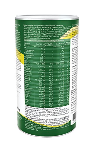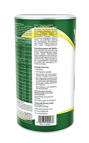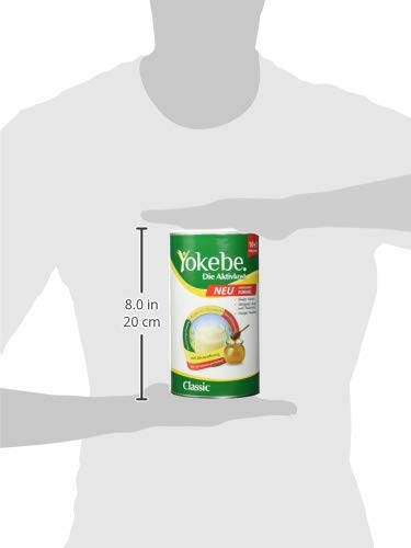 Produkteigenschaften:Bezeichnung:Lebensmittel. Mahlzeit für eine gewichtskontrollierende Ernährung.Verwendung/Anwendung/Verzehrempfehlung:Zubereitung für eine gewichtskontrollierende Ernährung:Als Ersatz für eine Mahlzeit werden 40 g Yokebe Classic (5 gestrichene Messlöffel) in 200 ml fettarme Milch (1,5% Fett) eingerührt und 1/2 TL (1,5 g) Pflanzenöl mit hohem Gehalt an ungesättigten Fettsäuren (Sonnenblumen-, Distel- oder Traubenkernöl) hinzugegeben.Bitte geben Sie immer zuerst die Milch in den Shaker und erst dann das Pulver. Die Mischung gut umrühren oder schütteln.Das Befolgen des Zubereitungshinweises ist erforderlich.Aufbewahrungsbedingungen:Kühl, trocken und vor Licht geschützt lagern.Nährwertdeklaration:Nährwerte;Pro 100 ml;% der RM** pro 100 ml;Pro Portion;% der RM** pro PortionBrennwert;433 kJ / 102 kcal;;5,4 g;Fett;2,2 g;;2,7 g; davon gesättigte Fettsäuren;1,1 g;;21,2 g; Kohlenhydrate;8,8 g;;18,3 g; davon Zucker;7,6 g;;2,1 g; Ballaststoffe;0,87 g;;27,0 g; Eiweiß;11,2 g; ;0,94 g; Salz;0,39 g;;; Vitamin A;120 g (RE);15%;289 g (RE);36%Thiamin (Vitamin B1);0,17 mg;15%;0,41 mg;37% Riboflavin (Vitamin B2);0,24 mg;17%;0,59 mg;42%Vitamin B6;0,21 mg;15%;0,51 mg;36%Vitamin B12;0,70 g;28%;1,7 g;68%Vitamin C;12,0 mg;15%;29,0 mg;36%Vitamin D;0,66 g;13%;1,6 g;32%Vitamin E;1,7 mg (alphaTE);14%;4,2 mg (alphaTE);35%Vitamin K1;11,2 g;15%;27,1 g;36%Biotin;8,45 g;17%;20,4 g;41%Folsäure ;29,9 g;15%;72,2 g;36%Niacin;2,4 mg (NE);15%;5,8 mg (NE);36%Pantothensäure;0,91 mg;15%;2,2 mg;37%Kalium;298 mg;15%;720 mg;36%Magnesium;55,5 mg;15%;134 mg;36%Calcium;164 mg;15%;396 mg;50