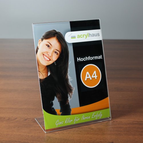 10 Stück L-Aufsteller DIN A4 Hoch Hochwertiger Acrylglasaufsteller in klassischer L-Form für den einseitigen Einzelblatteinschub im DIN A4 Hochformat, das einlegen und austauschen von Inhalten erfolgt schnell und unkompliziert. Durch seine geneigte Form ist der Inhalt auch von oben gut sichtbar. Der Werbeaufsteller hat sich für die verschiedensten Anwendungen vielfach bewährt, z.B. als Menükartenhalter, Preisschildhalter, Werbeaufsteller, Infoschild, Tischaufsteller, Hinweisschild, Werbeträger, Datenblatthalter, Werbedisplay. Acrylglas ist UV-Beständig daher ist der L-Aufsteller auch an Orten mit starker Sonneneinstrahlung einsetzbar und vergilbt nicht. Dieses Produkt wird eventuell mit einer Schutzfolie ausgeliefert die sich leicht entfernen läßt. Einschubformat: DIN A4 Hoch (210x297mm) Farbe: transparent / durchsichtig / klar / farblos Material: 2mm Acrylglas Anwendung: Tischaufsteller für Preisauszeichnung, Hinweisschilder…