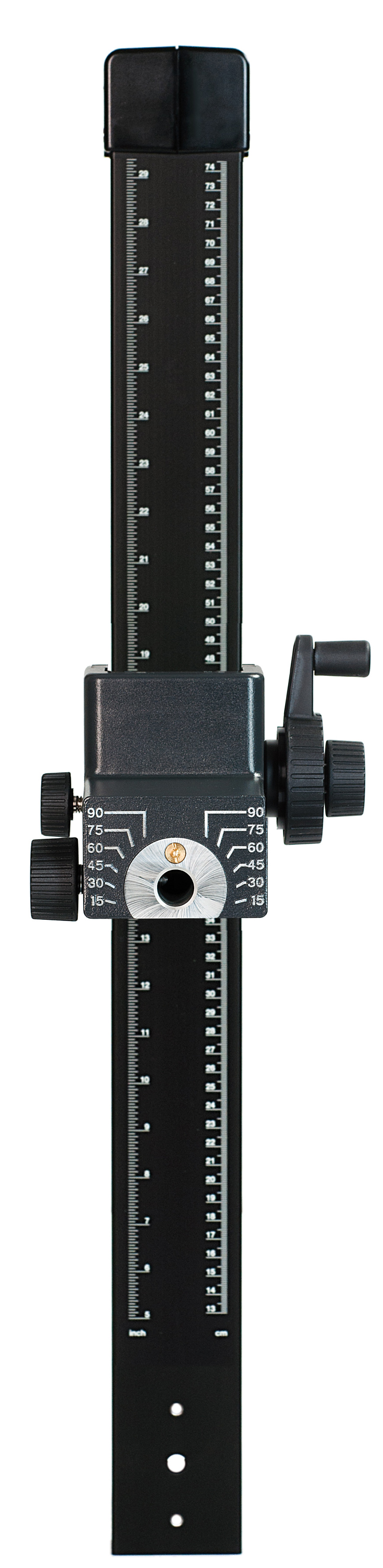 Breite und extrem vibrationsarme Führungssäule aus Aluminium-Profilrohr, mattschwarz eloxiert, mit cm- und inch-Skalen. Mit Haltearm und Befestigungsvorrichtung für Kameraarme und Gerätekopfunterteil 4568. Höhenverstellung mit Handkurbel.
