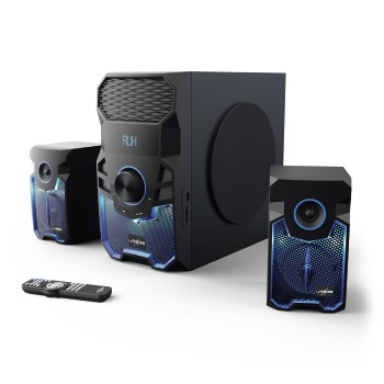 – intensiver Sound mit satten Bässen aufgrund nach vorne abstrahlendem Subwoofer im 360°-Bereich ,- Blue-Illuminating-Effect: blau beleuchtete Lautsprechergitter für eine originelle Atmosphäre beim Gamen und Musik hören ,- Gaming-Setup mit Subwoofer und zwei Satelliten ,- MP3-Wiedergabe über USB-Anschluss (Typ-A, 2.0, Host) oder SD-Slot ,- Anschluss per Kabel oder über Bluetooth (v4.0) ,- Bass- und Lautstärkeregelung am Subwoofer ,- automatischer Standby-Modus bei Nichtgebrauch ,- geeignet für PC, Konsolen, TV sowie andere Audiogeräte