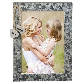 – silberner Porträtrahmen im modernen Design ,- Metallrahmen in feuerverzinkter Optik ,- mit Herz-Applikationen Live und Laugh ,- zum Stellen und Hängen in Hoch- und Querformat ,- hochwertige Samtrückwand