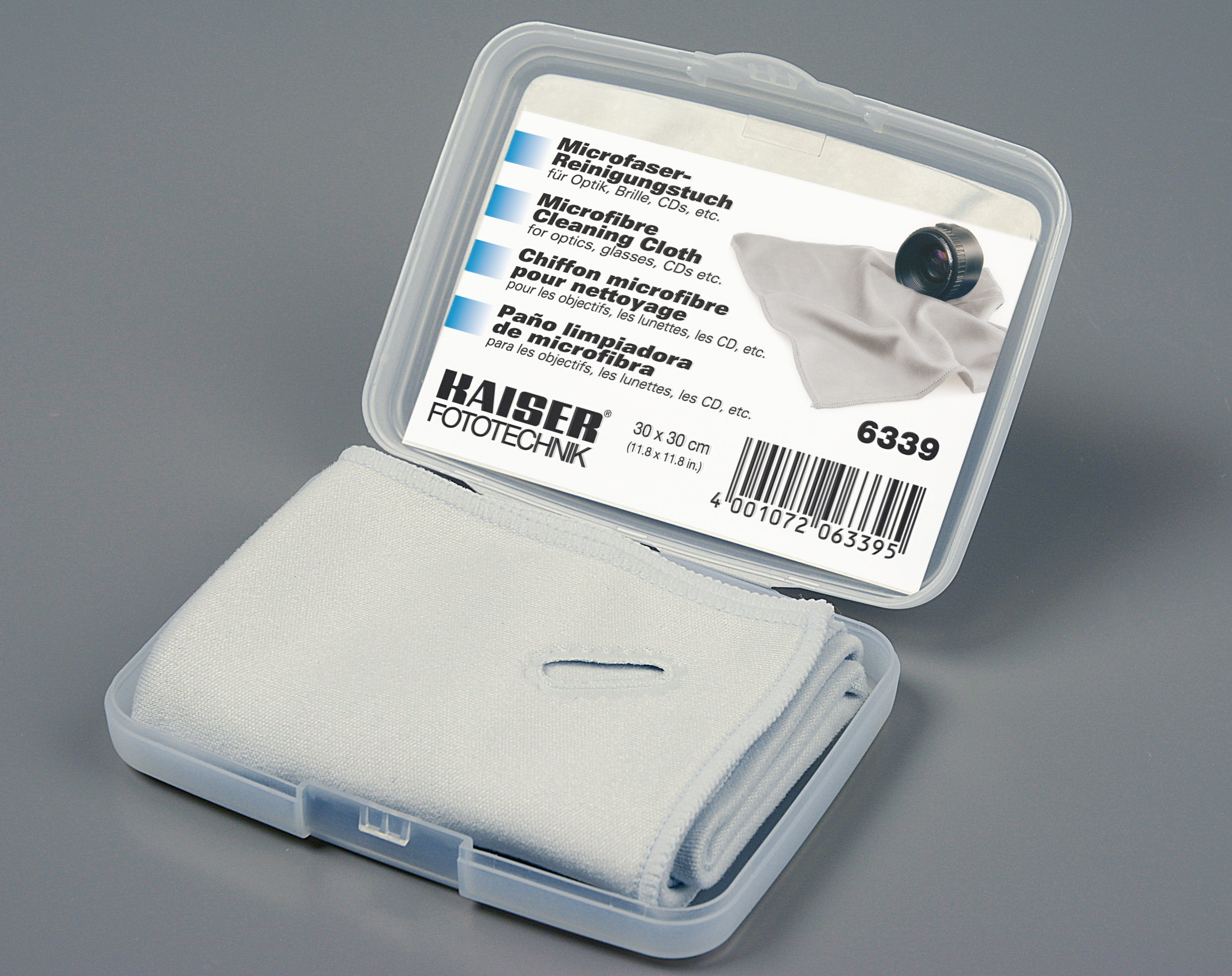 Premium-Microfaser-Reinigungstuch, 30 x 30 cm, silbergrau, mit umsäumtem Rand und Knopfloch, in Kuns$