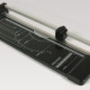 Automatische Anpressung des Schneidguts an der Schnittstelle mit transparentem Andrucklineal. Stabiler Schneidetisch aus Metall, mit aufgedruckten Skalen, Formatmarkierungen und Grad-Einteilung.