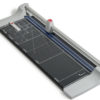 Automatische Anpressung des Schneidguts an der Schnittstelle mit transparentem Andrucklineal. Stabiler Schneidetisch aus Metall, mit aufgedruckten Skalen, Formatmarkierungen und Grad-Einteilung.