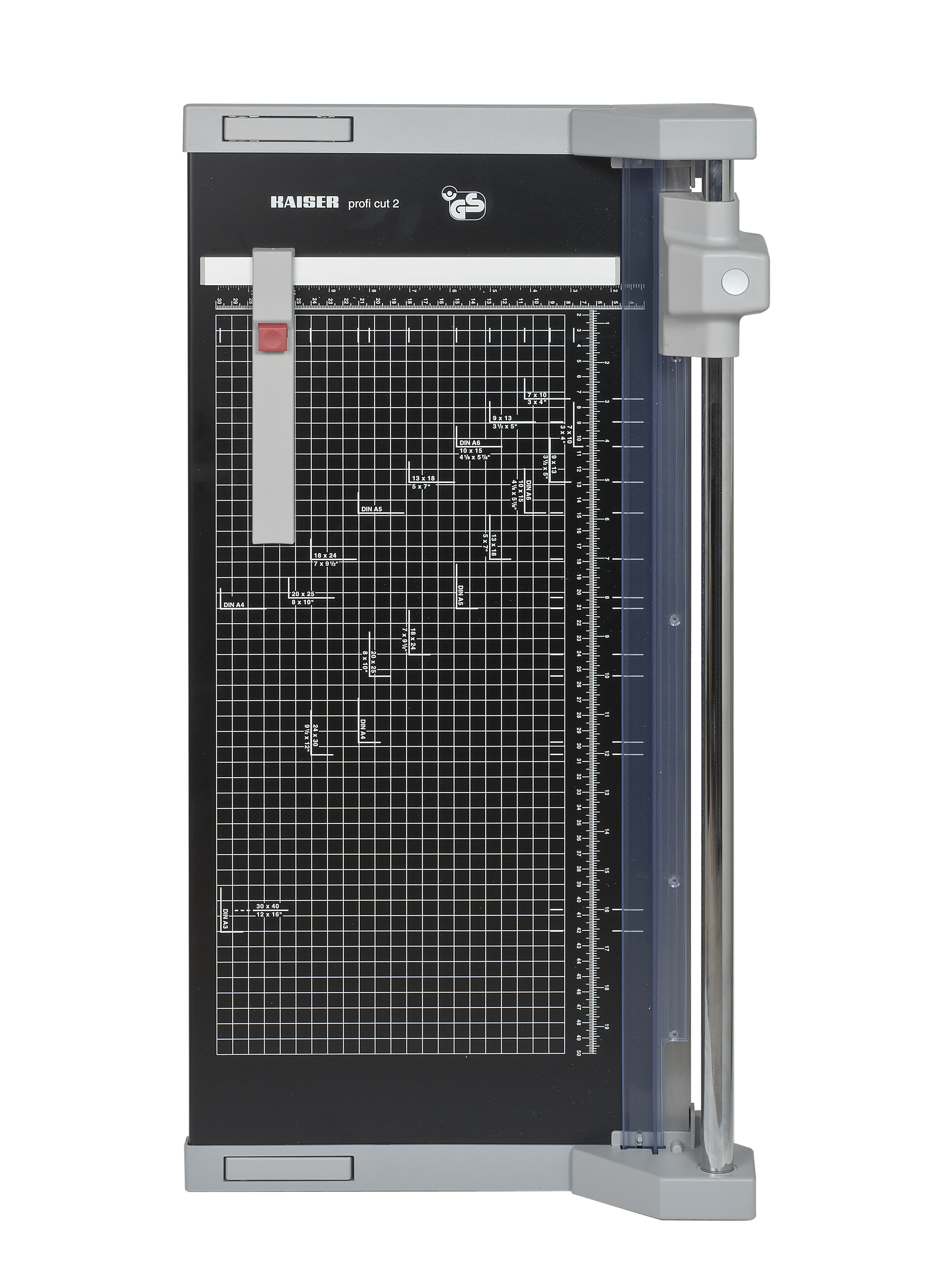 Mit geschliffenem, rotierendem Rundmesser, selbstschärfend, in geschlossenem Kunststoffkopf. Geschliffenes Untermesser. Automatische Anpressung des Schneidgutes an der Schnittstelle. Transparentes Andrucklineal. Winkelanlage mit cm- und inch-Skala und abnehmbarem, magnetischem Rückanschlag. Papiertisch mit cm- und inch-Skala sowie Formatmarkierungen. Wandbefestigung möglich.
