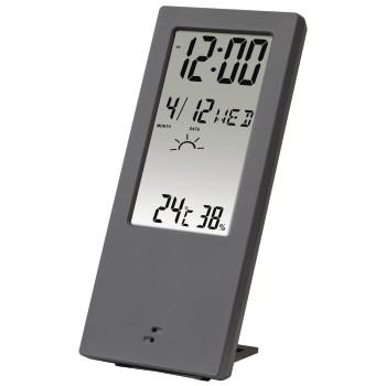 Thermometer: ,- umschaltbar zwischen Grad Celsius und Fahrenheit ,- Speicherung der min./max. Werte für Temperatur ,- Messbereich: -40°C bis +50°C , ,Hygrometer: ,- Wetterindikator: sonnig, bewölkt, regnerisch (basiert auf der Veränderung der Luftfeuchtigkeitswerte) ,- Speicherung der min./max. Werte für Luftfeuchtigkeit ,- Messbereich: 20% bis 90% , ,Uhr-/Kalender-/Weckfunktion: ,- Uhrzeit umschaltbar 12-/24-h-Format ,- Datum- und Wochentaganzeige ,- Alarm- und Snoozefunktion , ,- ausziehbarer Klapp-Standfuß