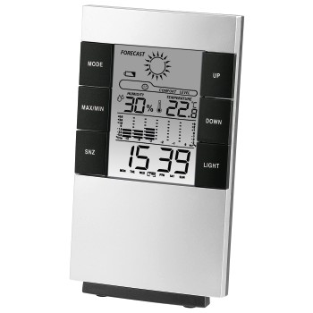 Thermometer: ,- Anzeige von Innen- und Außentemperatur ,- Trendanzeige ,- max./min. Datenspeicher der Temperatur ,- umschaltbar zwischen Grad Celsius und Fahrenheit , ,Barometer: ,- Luftdruckverlauf der letzten 24 Stunden (Balkenanzeige) , ,Hygrometer: ,- max./min. Datenspeicher der Luftfeuchtigkeit , ,Uhr-/Kalender-/Weckfunktion: ,- Uhrzeit umschaltbar 12/24-h-Format ,- Datumsanzeige (Wochentag, Tag, Monat) ,- Wochentagsanzeige (6 Sprachen: Deutsch, Englisch, Französisch, Italienisch, Spanisch, Niederländisch, Dänisch) ,- Alarmfunktion und Schlummerfunktion , ,- ansprechendes, farbenfrohes Display als Blickfang in jedem Raum ,- Symbol informiert bei niedriger Batteriekapazität von Station und Außensensor (Station nur bei Batteriebetrieb) ,- Montagemöglichkeit an der Wand oder zum Aufstellen